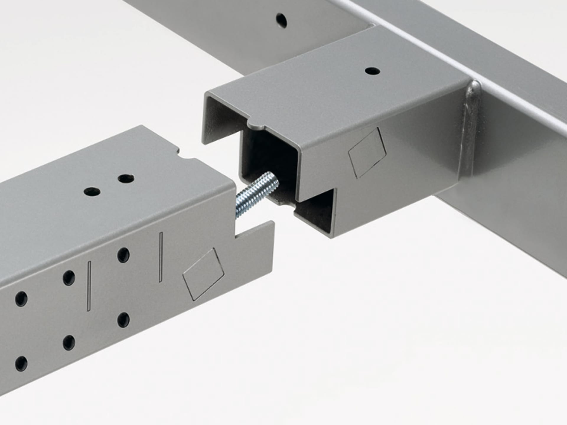 In het tafelblad verzonken adapters maken het mogelijk tafelreling en panelen te bevestigen en contactdozen te integreren.